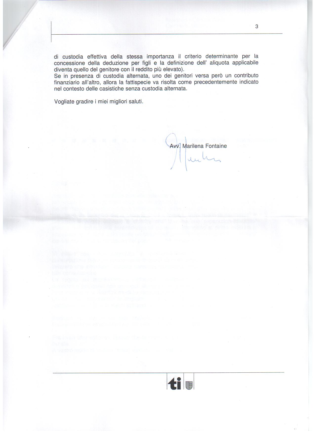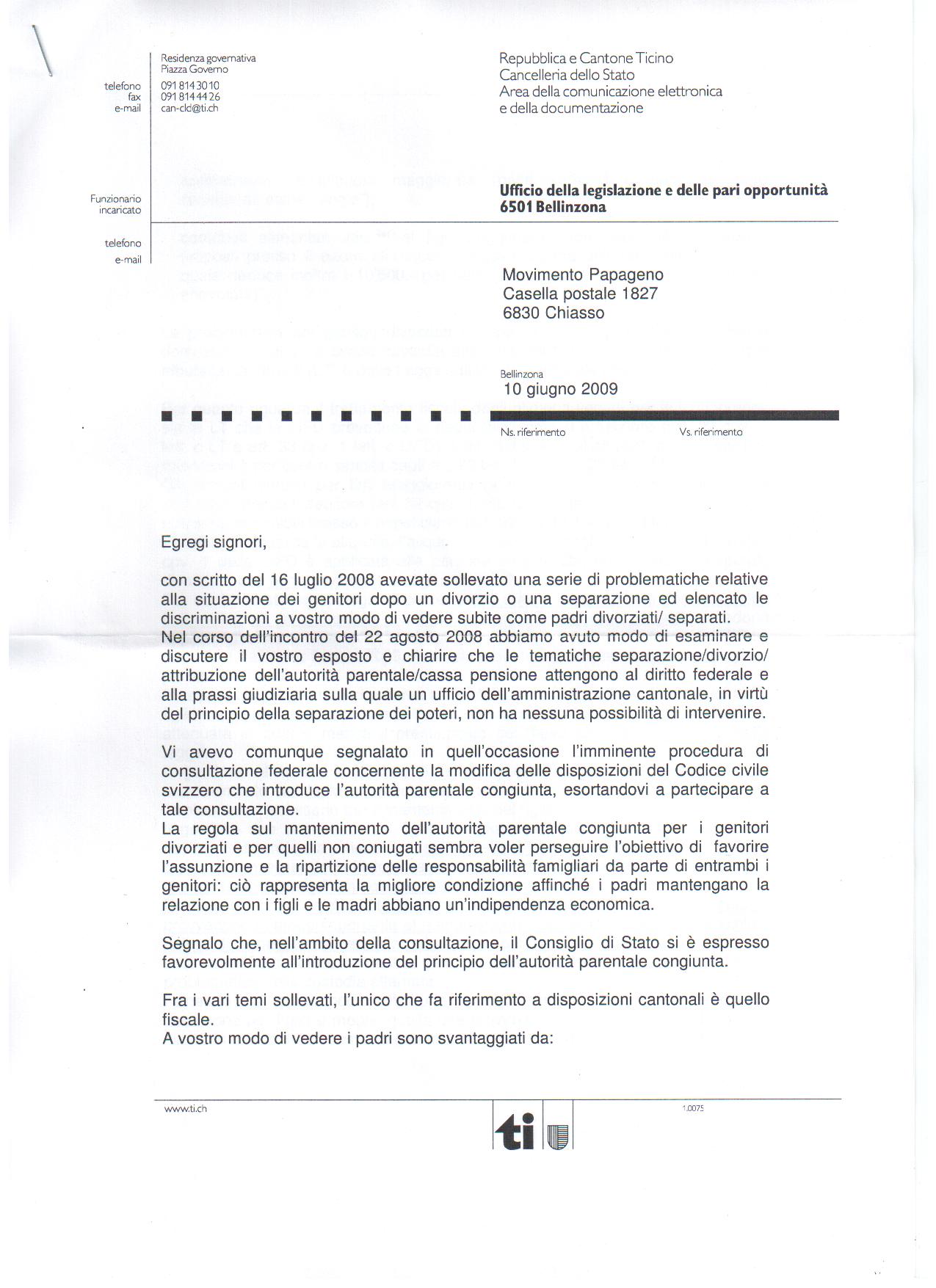10.06.2009. La delegata alle pari opportunità avv Marilena Fontaine risponde al Movimento Papageno (quasi un anno dopo), a seguito del sollecito del deputato al Gran Consiglio Donatello Poggi: