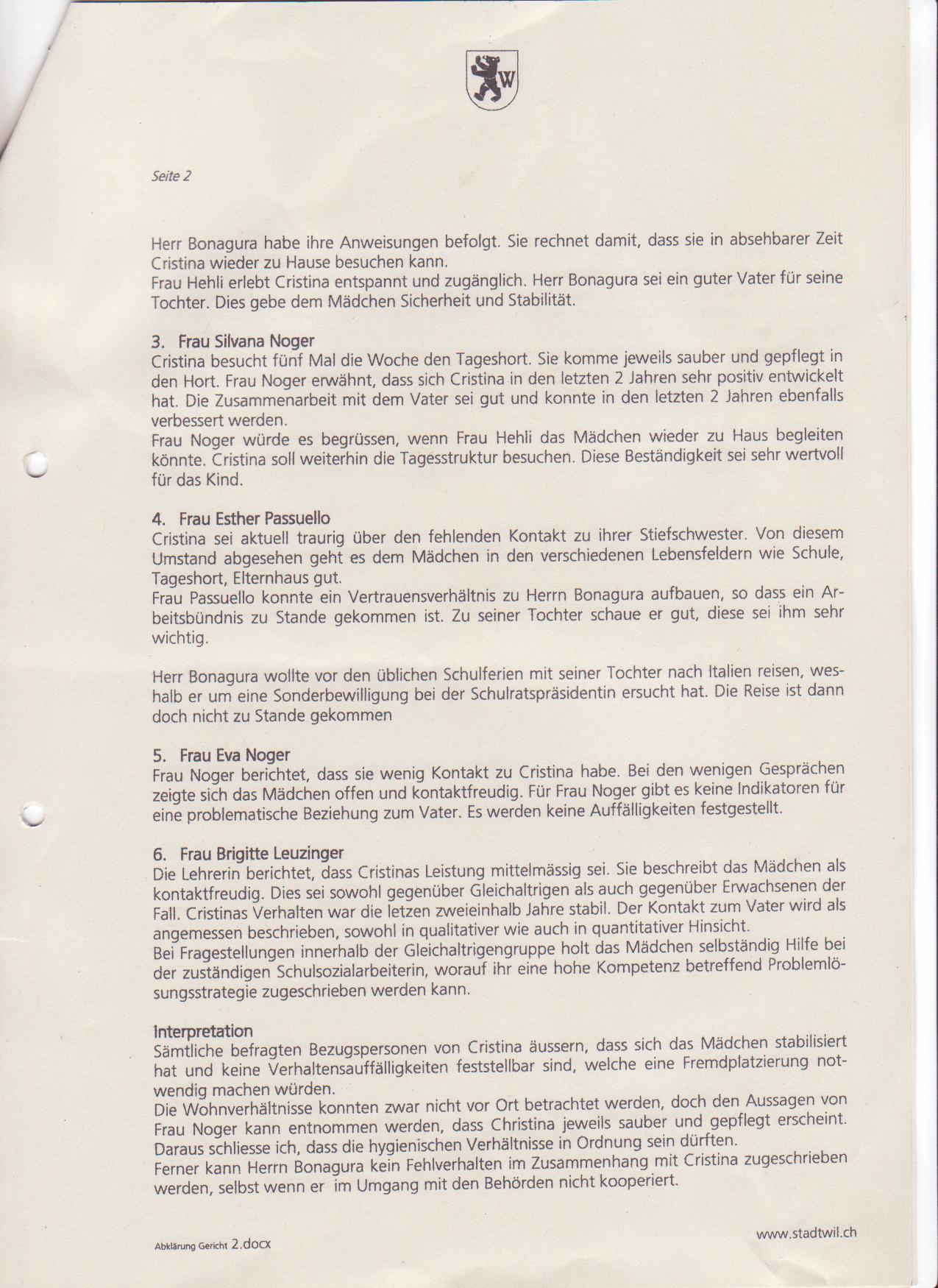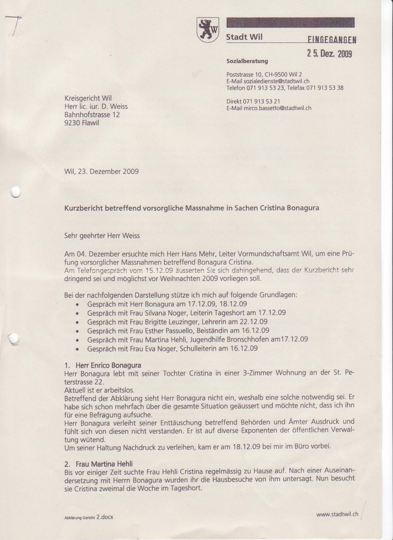 Wil, 13.06.10. Mi chiamo Bonagura Enrico . Sono Italiano . Nato il 01-10-1958 a Napoli . Da 12 anni mi batto contro gli abusi, i soprusi e le persecuzioni della Magistratura di San Gallo . Non sapendo più cosa fare per fermarmi , hanno praticamente sequestrato mia Figlia Cristina di 9 Anni, con calunnie e infamanti diffamazioni . Un continuo incitamento al Crimine, finalizzato a nascondere poi tutti i loro soprusi . Con la solita frase " LO SAPEVAMO CHE ERA PERICOLOSO " . Se guardate questo video capirete che mia Figlia è in perfette condizioni di salute e felice. Mi sono separato da mia moglie il 1. ottobre 2007 e da subito lei mi ha lasciato in affido la nostra figlia Cristina e la sua figlia Nikol avuta da un altro uomo, andando a vivere da sola. Da allora mia figlia Cristina ha vissuto sempre con me, fino al 3 giugno 2010, giorno in cui il Giudice Weiss, contro il parere dei servizi sociali. Infatti, come si può leggere dalla lettera che segue, i servizi sociali sono contrari ad un collocamento della mia bambina:
