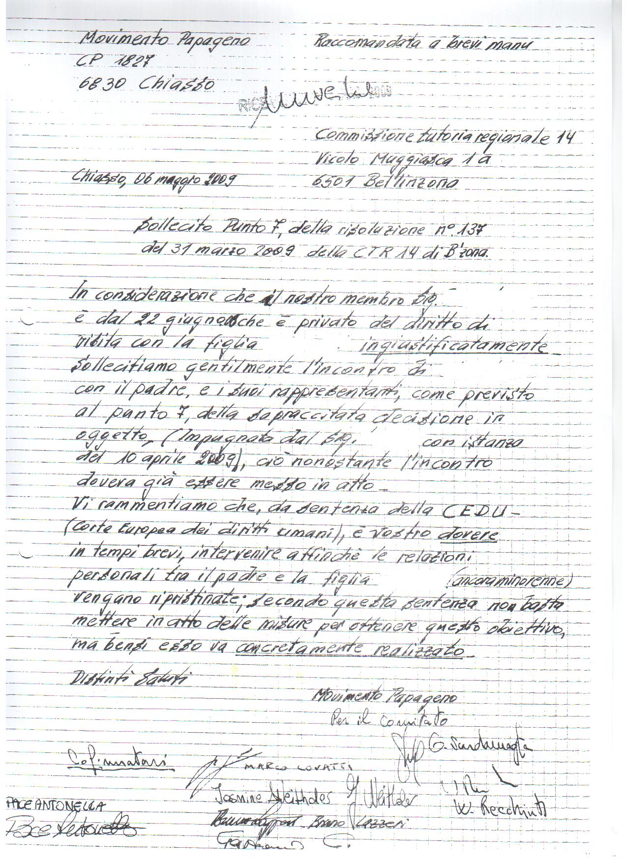 Alcuni membri del Movimento Papageno hanno consegnato una lettera alla CTR 14 per sostenere questo padre e per richiedere (sulla base di una sentenza CEDU emessa nel lontano 2005) che la CTR 14 metta in atto delgi interventi al fine di ottenere un risultato concreto (e non solo tanto per fare).