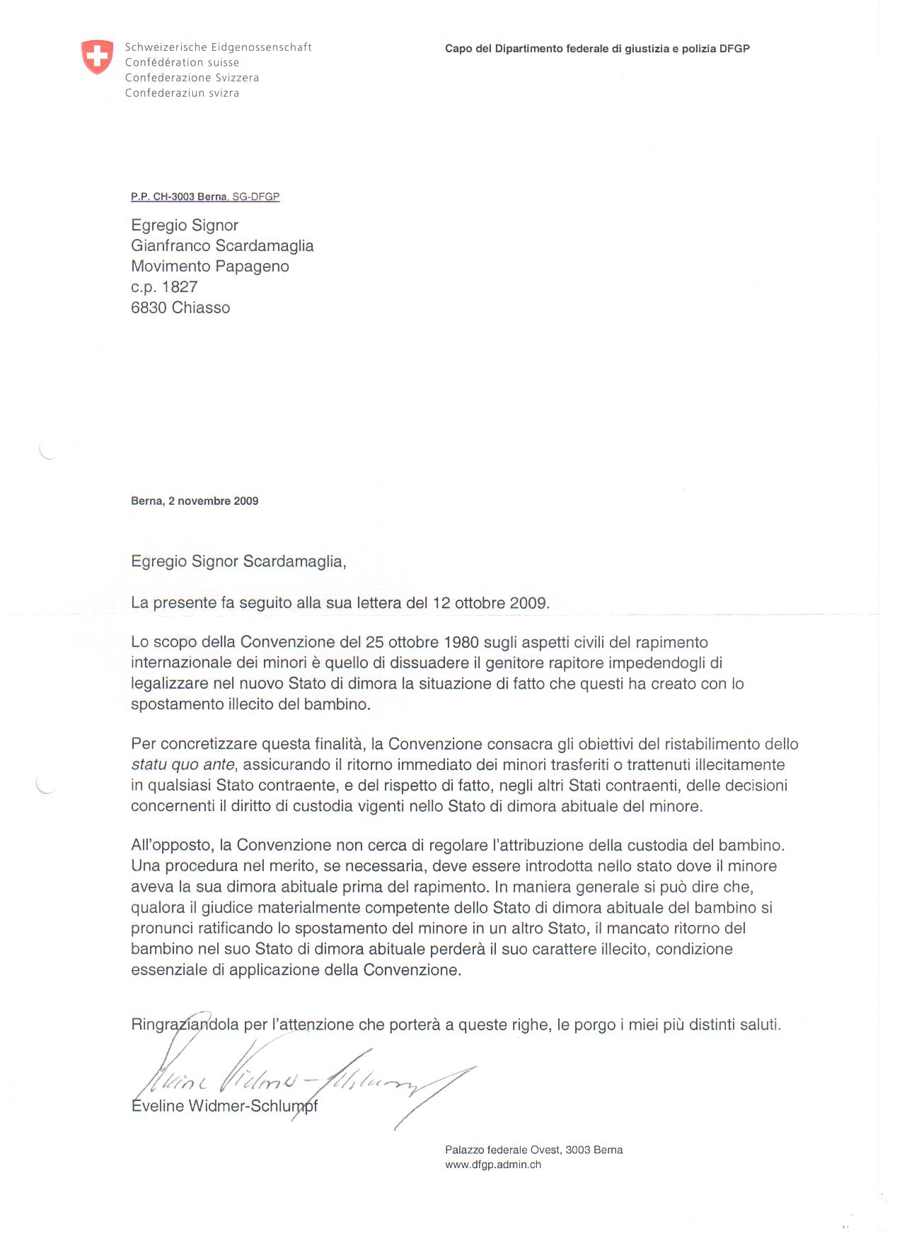 Per il rapimento dei figli di Walter Recchiuti, in data 12.10.2009 il Movimento Papageno scrive una lettera alla Consigliera Federale Eveline Widmer-Schlumpf, alla quale la Consigliera Federale risponde il 2.11.2009. Nel frattempo e prima della risposta della Consigliera federale, il Pretore di Locarno avv Bertini Francesco ha emesso la sua sentenza di affidamento della prole alla madre che ha sottratto i figli al padre.