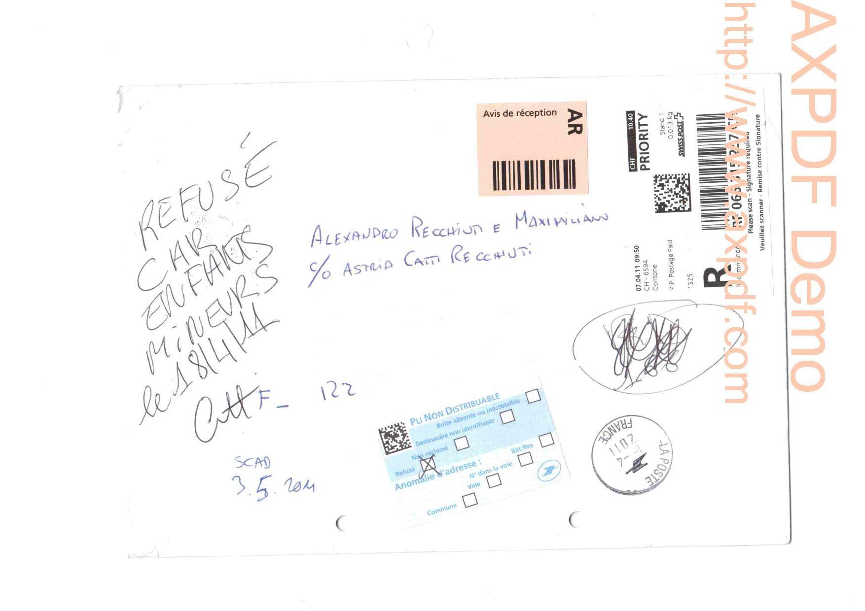 Nella sentenza del 19 ottobre 2009 emessa dal Pretore Francesco Bertini, tra l'altro autorizzante la madre A. Catti Recchiuti a risiedere in Francia coi due figli di 3 e 8 anni, il Giudice ha richiamato esplicitamente le parti ad "astenersi da tutto ciò che potrebbe alterare i rapporti dei figli con l'altro genitore (art. 274 cpv 1 CC)". Malgrado ciò, la madre continua ad ostacolare il rapporto del padre Walter Recchiuti con i propri due figli. Nello specifico, il padre ha scritto una lettera ai suoi due adorati bambini da cui è privato a causa della scelta unilaterale della madre di trasferirsi in Francia (decisione di trasferimento, come detto, autorizzata poi dal Pretore Bertini). La lettera è stata inviata per raccomandata. La madre, invece di ritirare la raccomandata del padre e consegnarla ai due figli, l'ha semplicemente respinta con la seguente motivazione apposta di suo pugno sulla busta: "REFUSÉ CAR ENFANTS MINEURS, le 18/4/11, firmato CATTI" (Respinto poiché bambini minorenni).